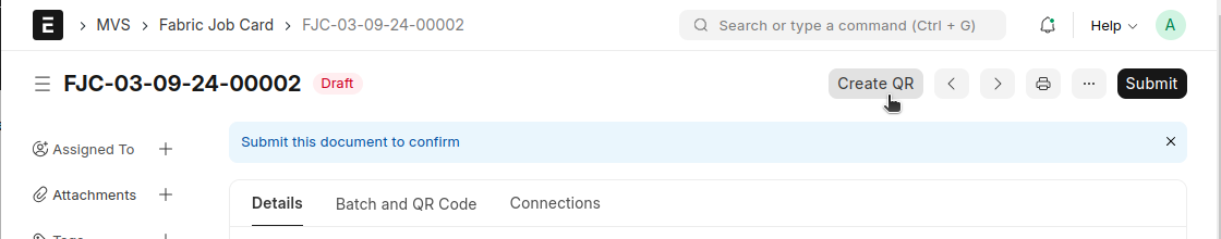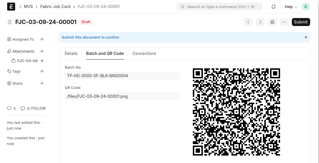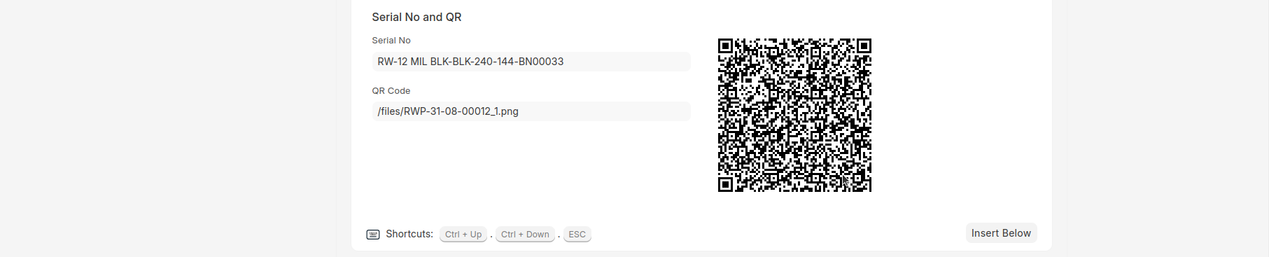 input all field required datas and save then create a Batch No and there is button comes for create QR Code > then Submit > Create a manufacturing Stock Entry