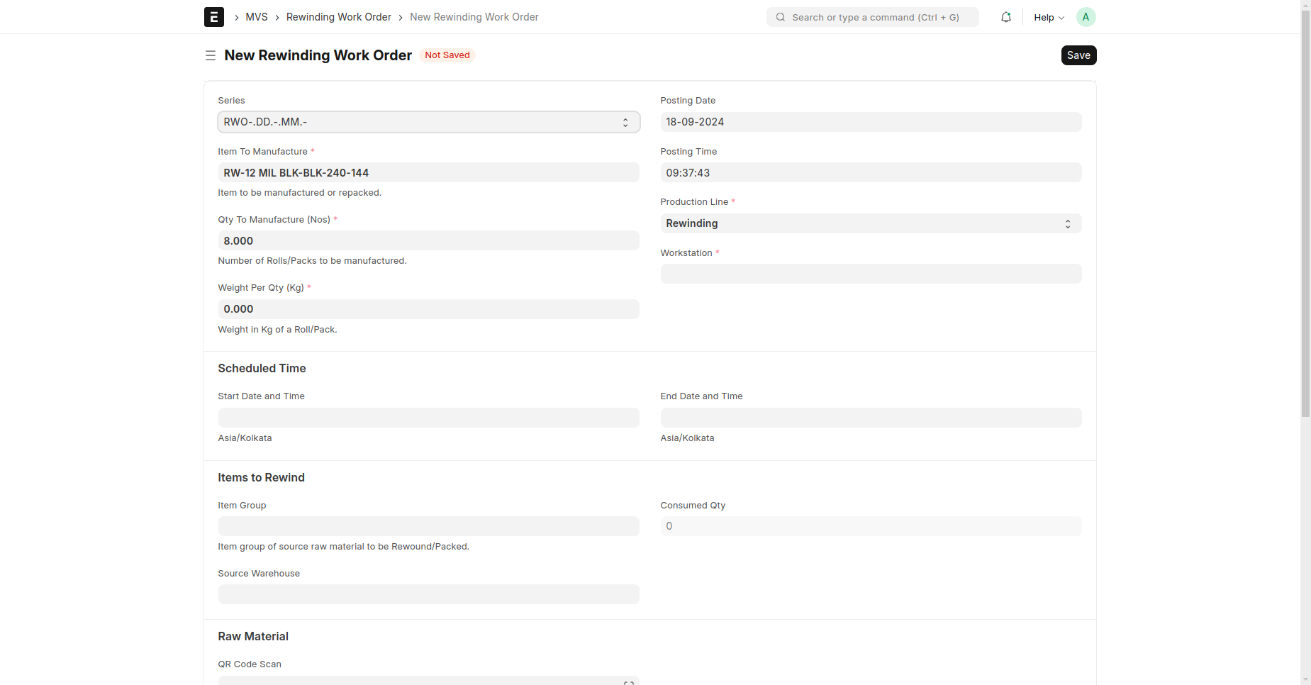 Selection: If the Rewinding Work Order is created directly (not via BOM), select the relevant BOM No.
