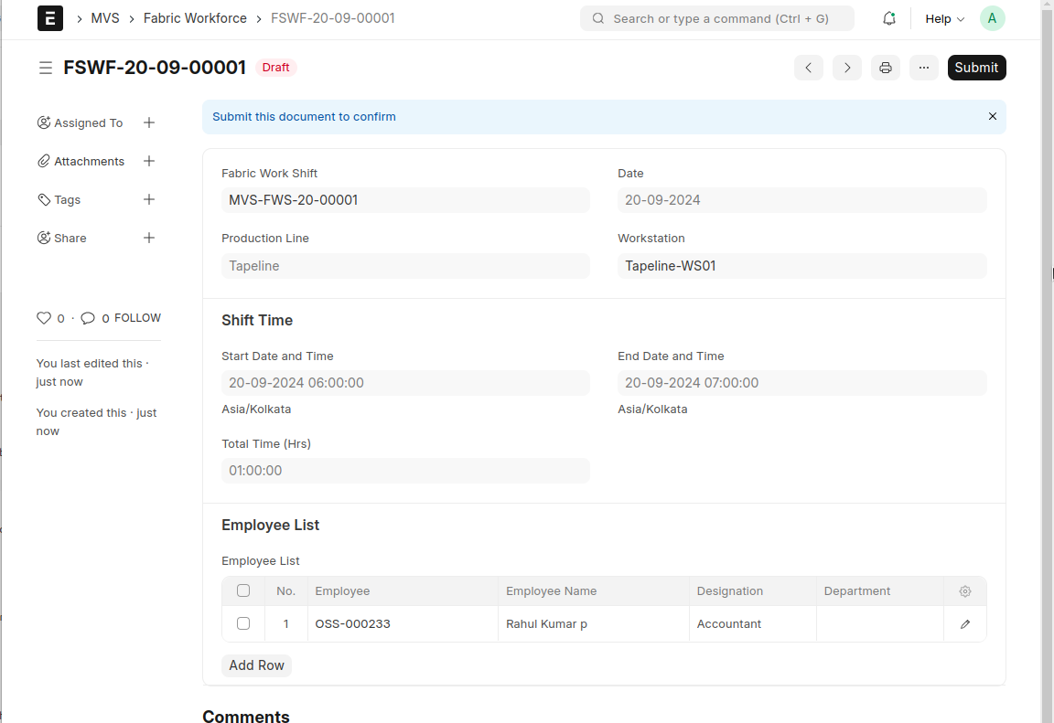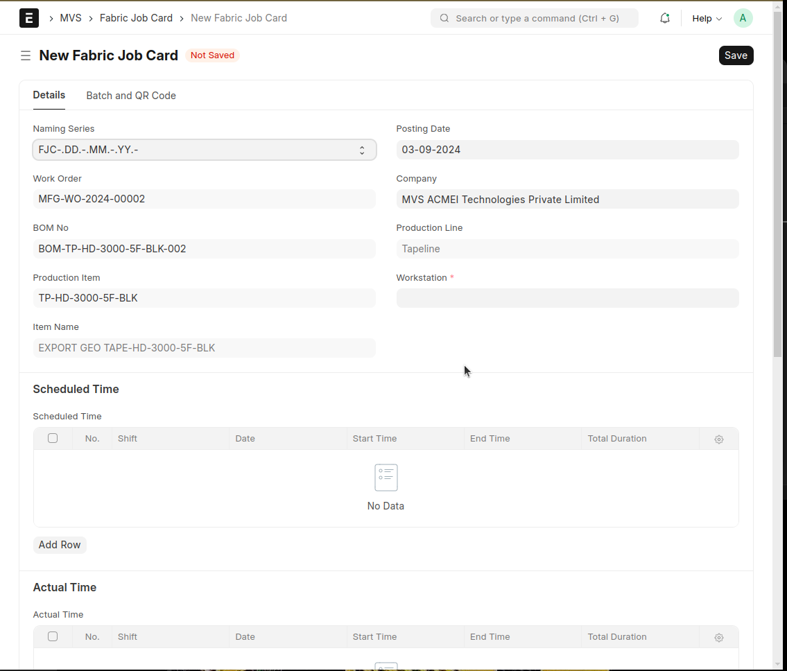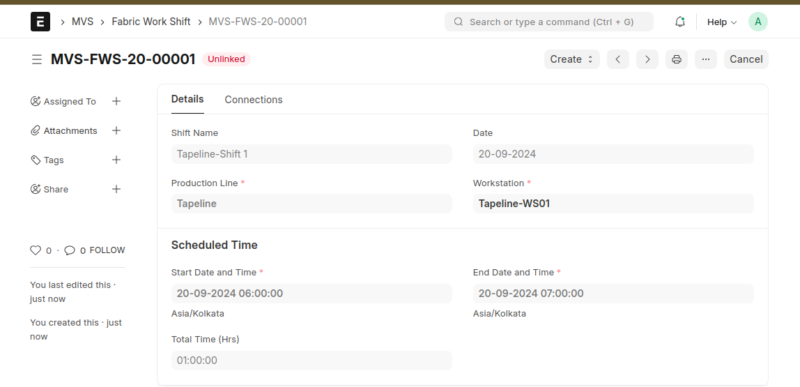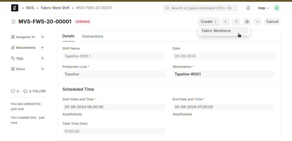 In the Schedule Time and Actual Time sections, the Fabric Work Shift doctype is used to create shifts for each day and each shift. A Fabric Workforce doctype must be created for every Fabric Work Shift because employees (production staff) are assigned to the Fabric Work Shift.