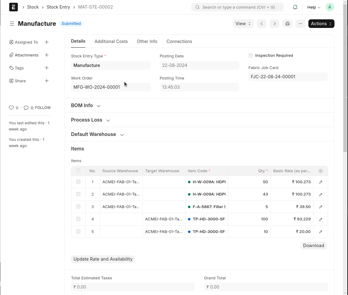 Additional Cost = Source Item Total Weight(Kg) × Workstation Cost AdditionaL Cost=Source Item Total Weight (Kg)×Workstation Cost Enter the calculated additional cost into the Additional Cost field based on the selected workstation.