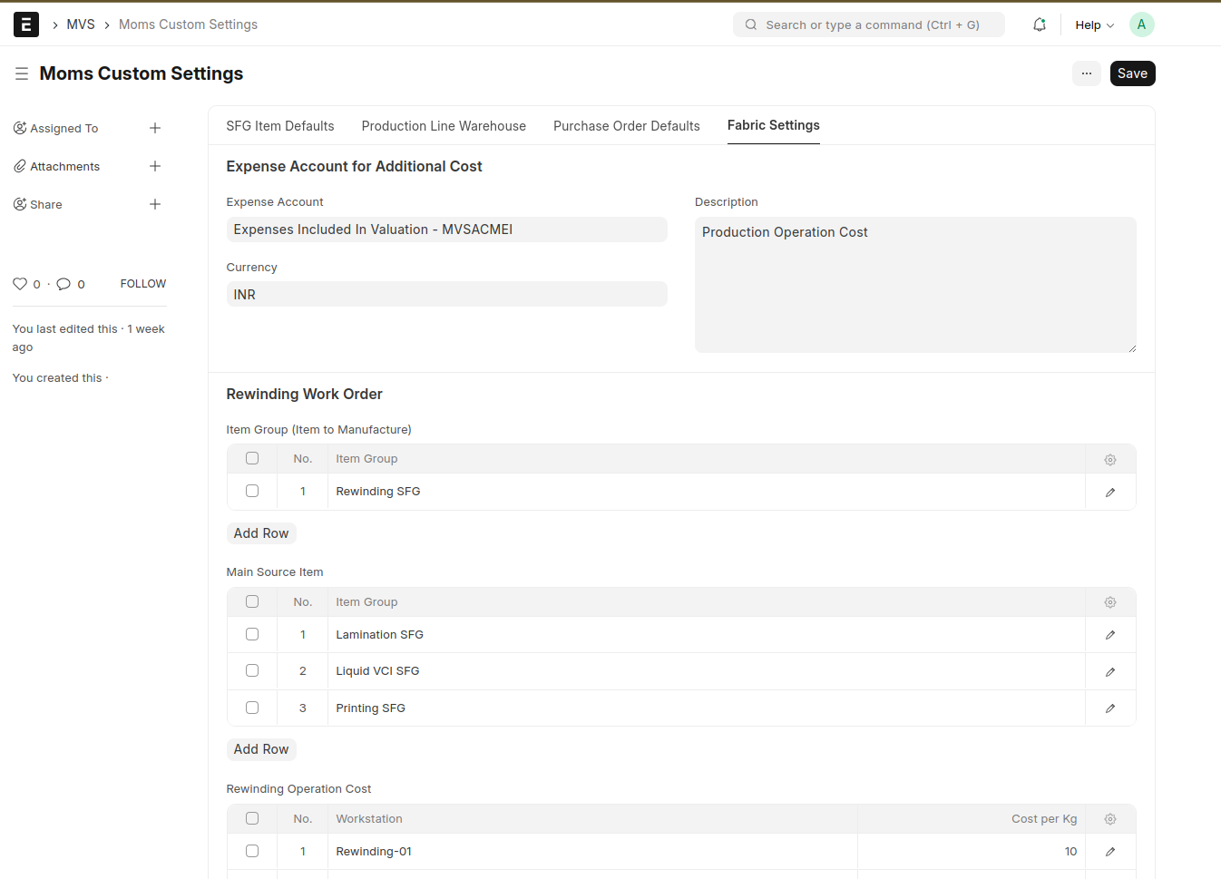 3.3 Operation Tab Additional Cost: Calculation: Source Item Total Weight (Kg): Obtain this from the Rewinding Work Order or relevant document. Workstation Cost: Refer to the "MOMS Custom Settings" doctype under the “Rewinding Operation Cost” table.