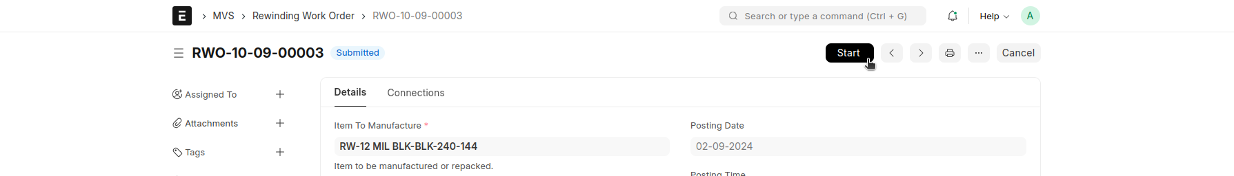 Save and Submit: Save and submit the Rewinding Work Order. Start Button: After submission, a "Start" button appears. Click this to generate a Rewinding Job Card.