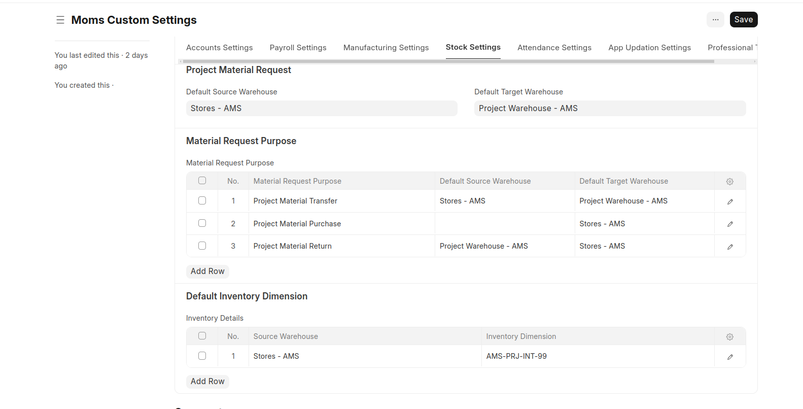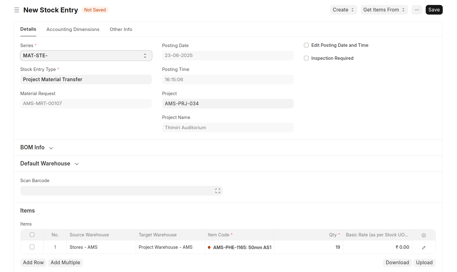 During validation, the Source and Target Inventory Dimensions are automatically populated based on the selected Stock Entry Type.