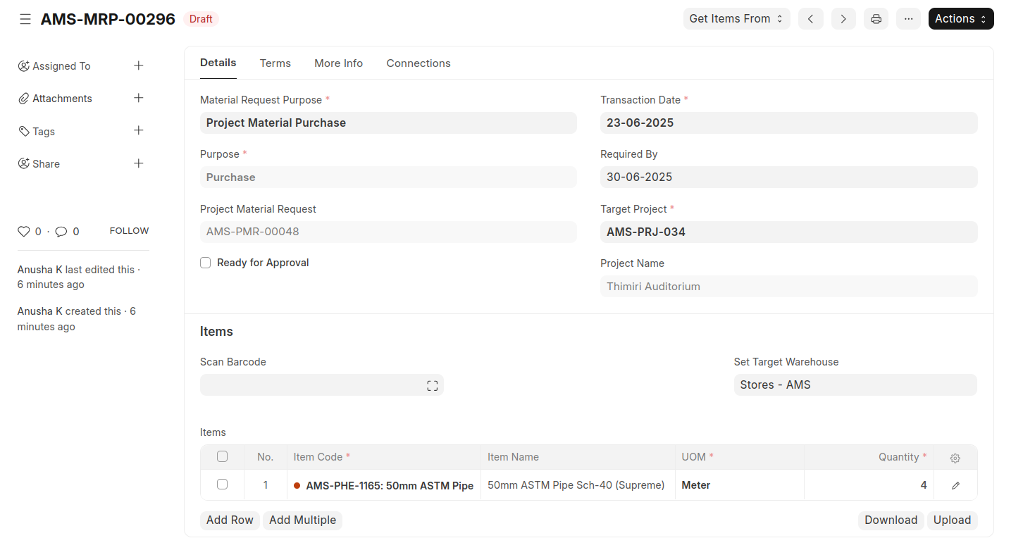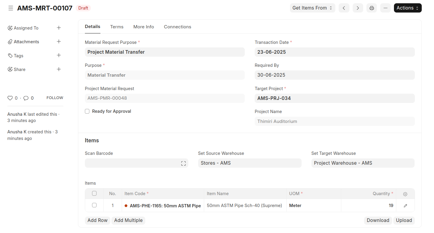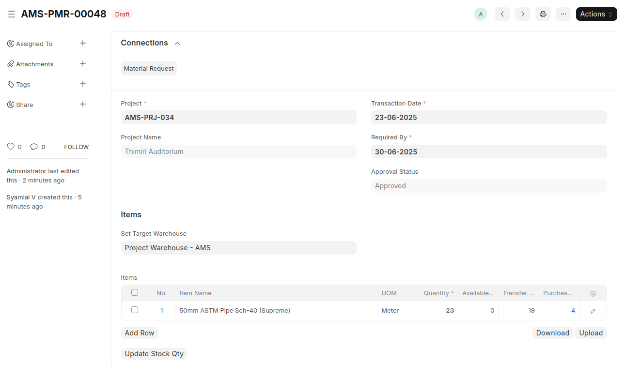 Once the request is verified, the Project Material Request Approver changes the Approval Status from Draft to Approved.