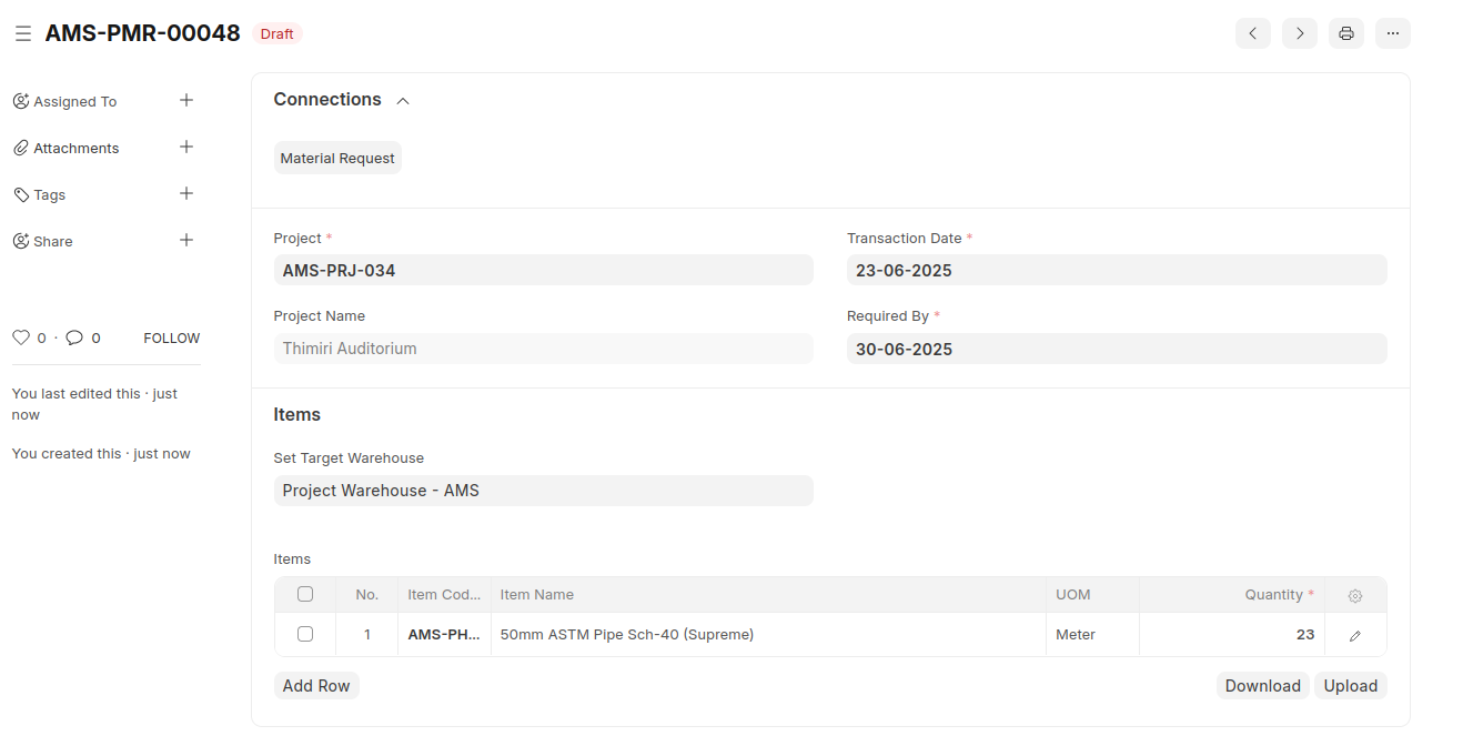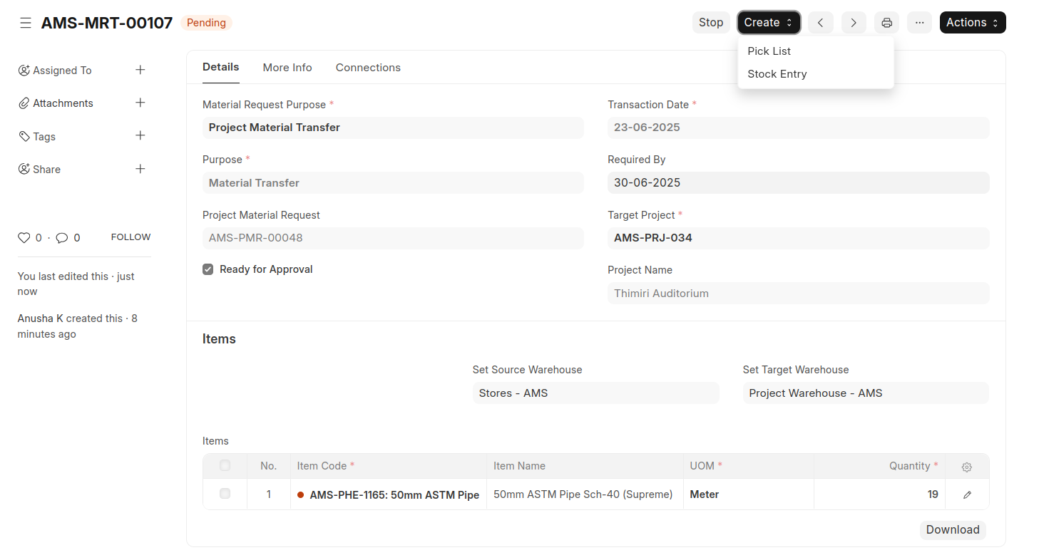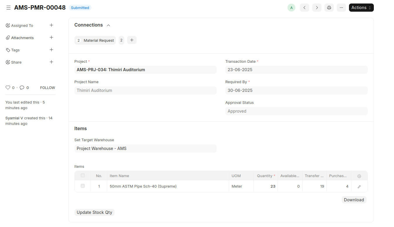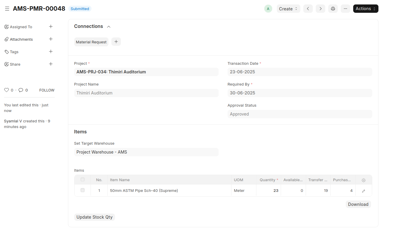 Once the request is verified, the Project Material Request Approver changes the Approval Status from Draft to Approved.