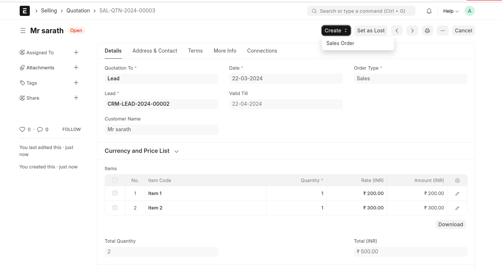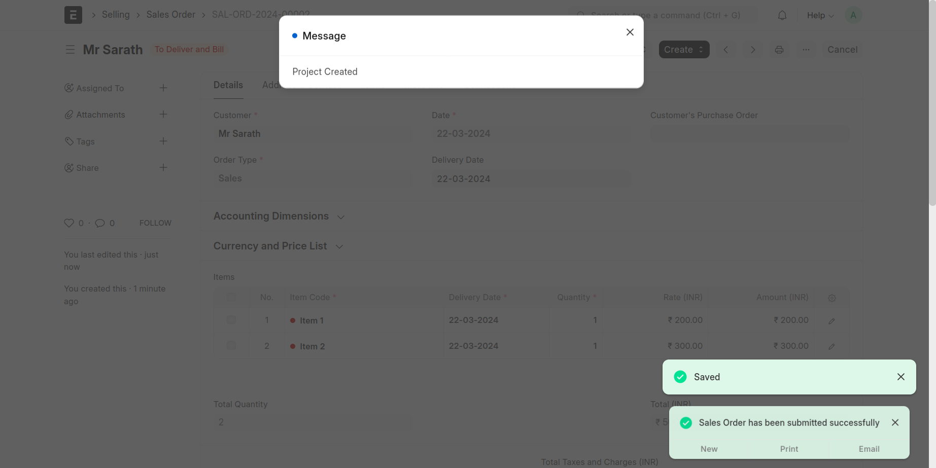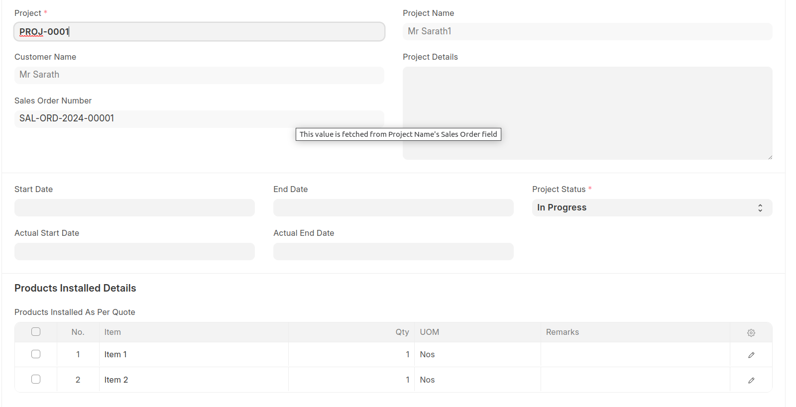Then Select Project- That Time Quoted Items In The Sales Order Will List In The 'Products Installed As Per Quote' Table.