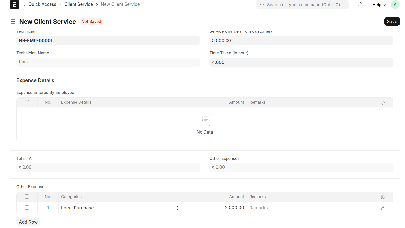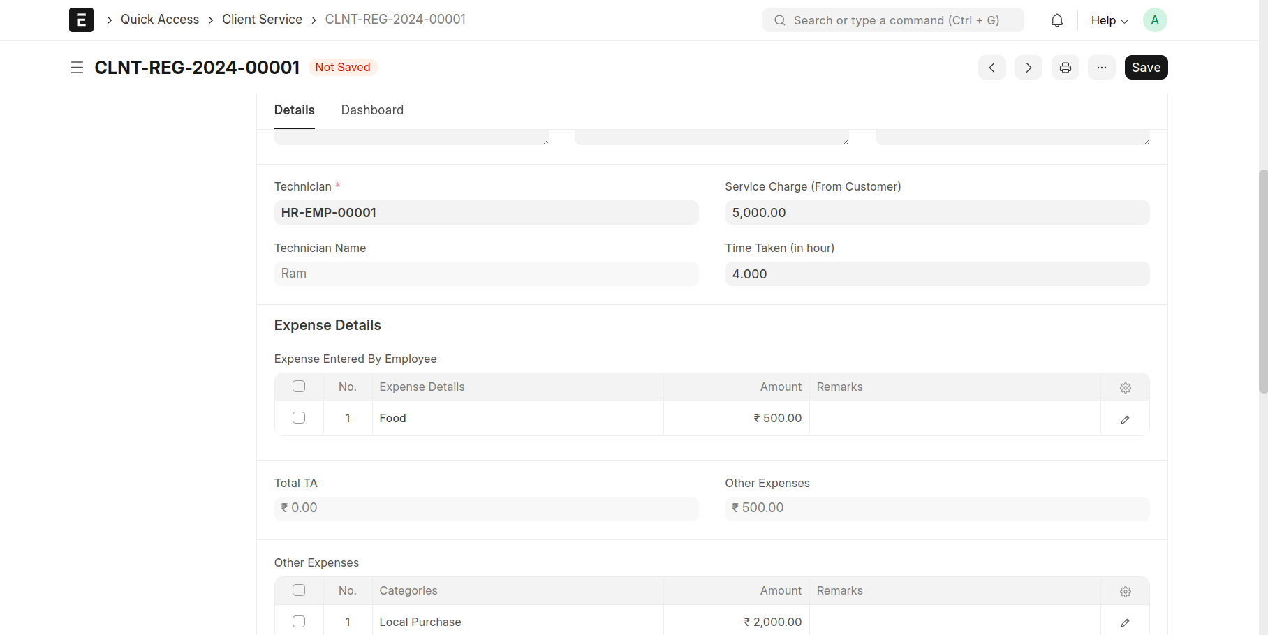 Then Select Customer. Select The Technician Which Are Allocated In The Corresponding Service. And Enter The Time Taken By The Employee To Complete That Work. Collected Amount Enter The Field 'Service Charge (From Customer)'. Fill The 'Other Expense Table' And Press The Button 'Total Income' That Time Show The Total Income.You can Also Mark The Employee Performence In That Particular Service