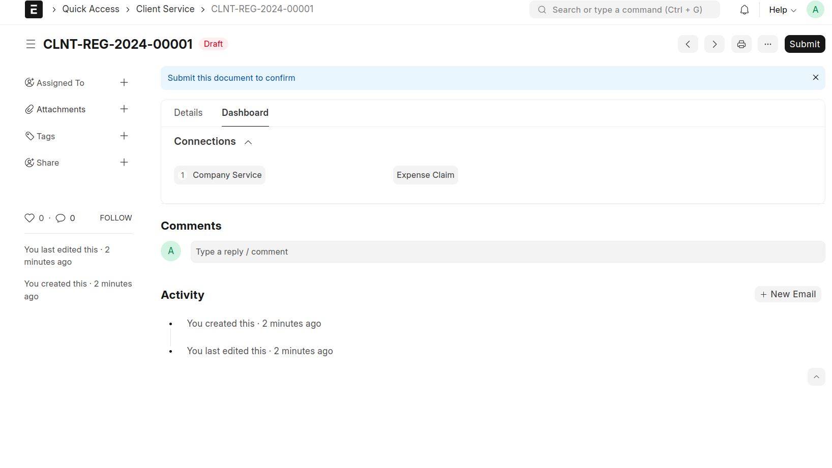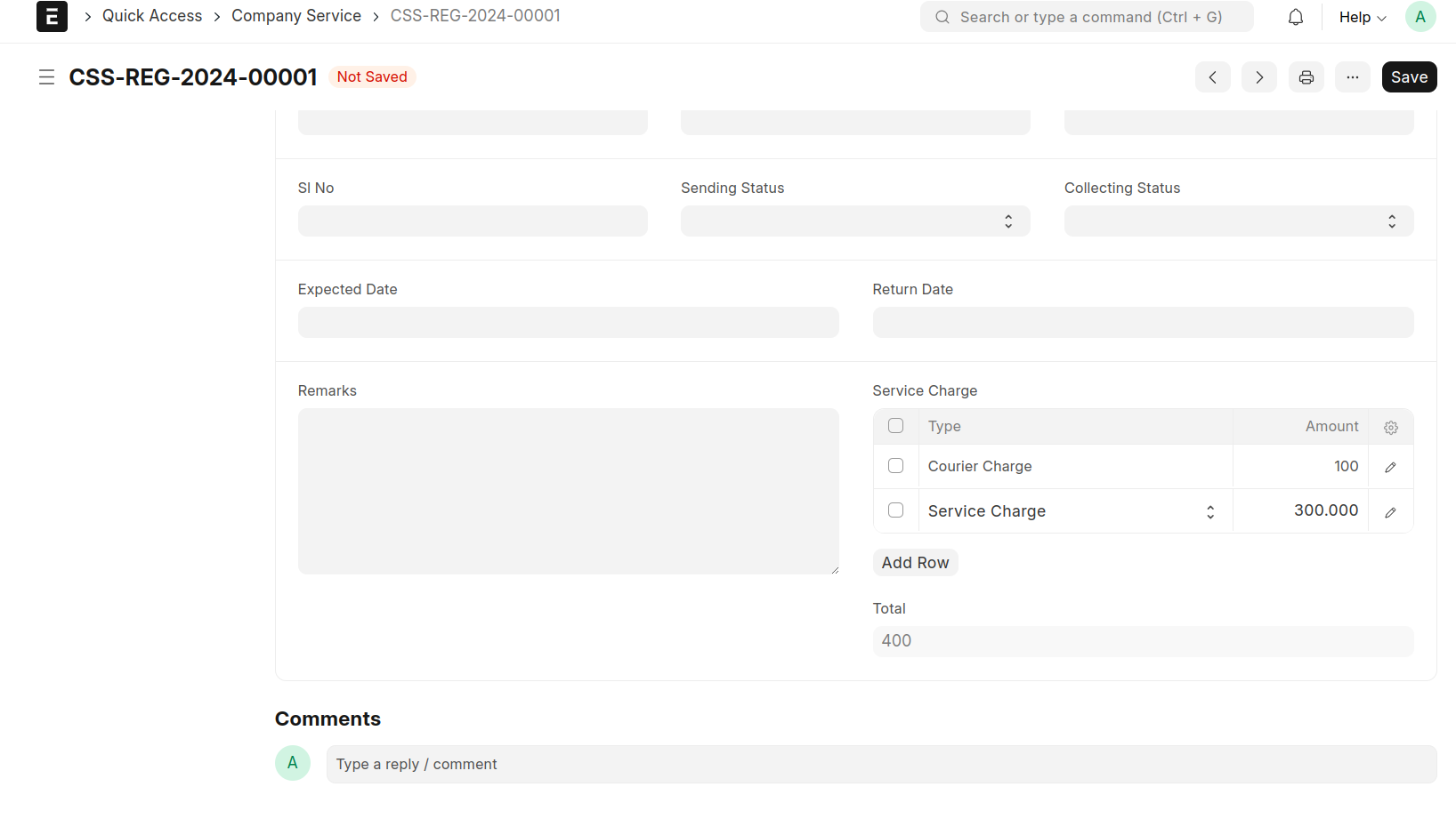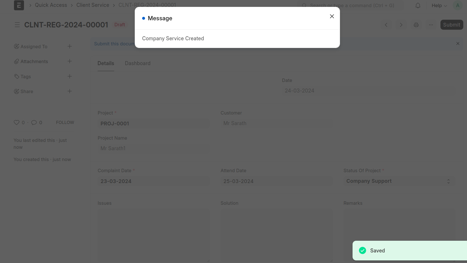 Here Status Of Project Is 'Company Support' then Save That Time New Company Service Document Is Create