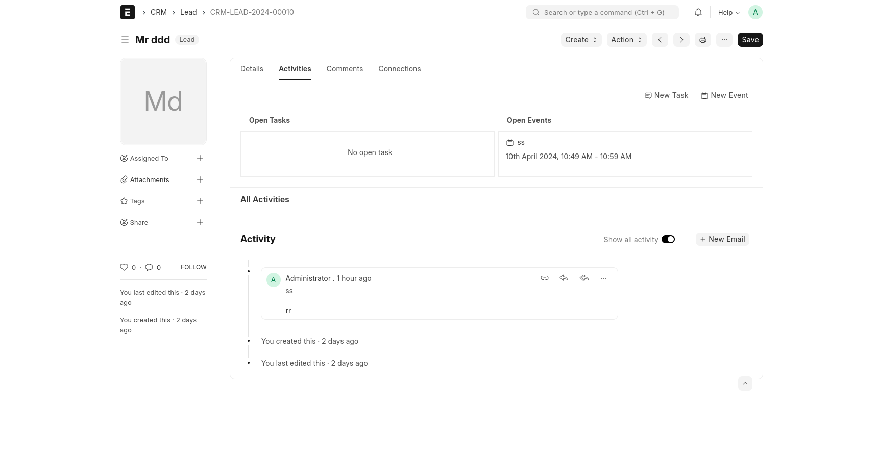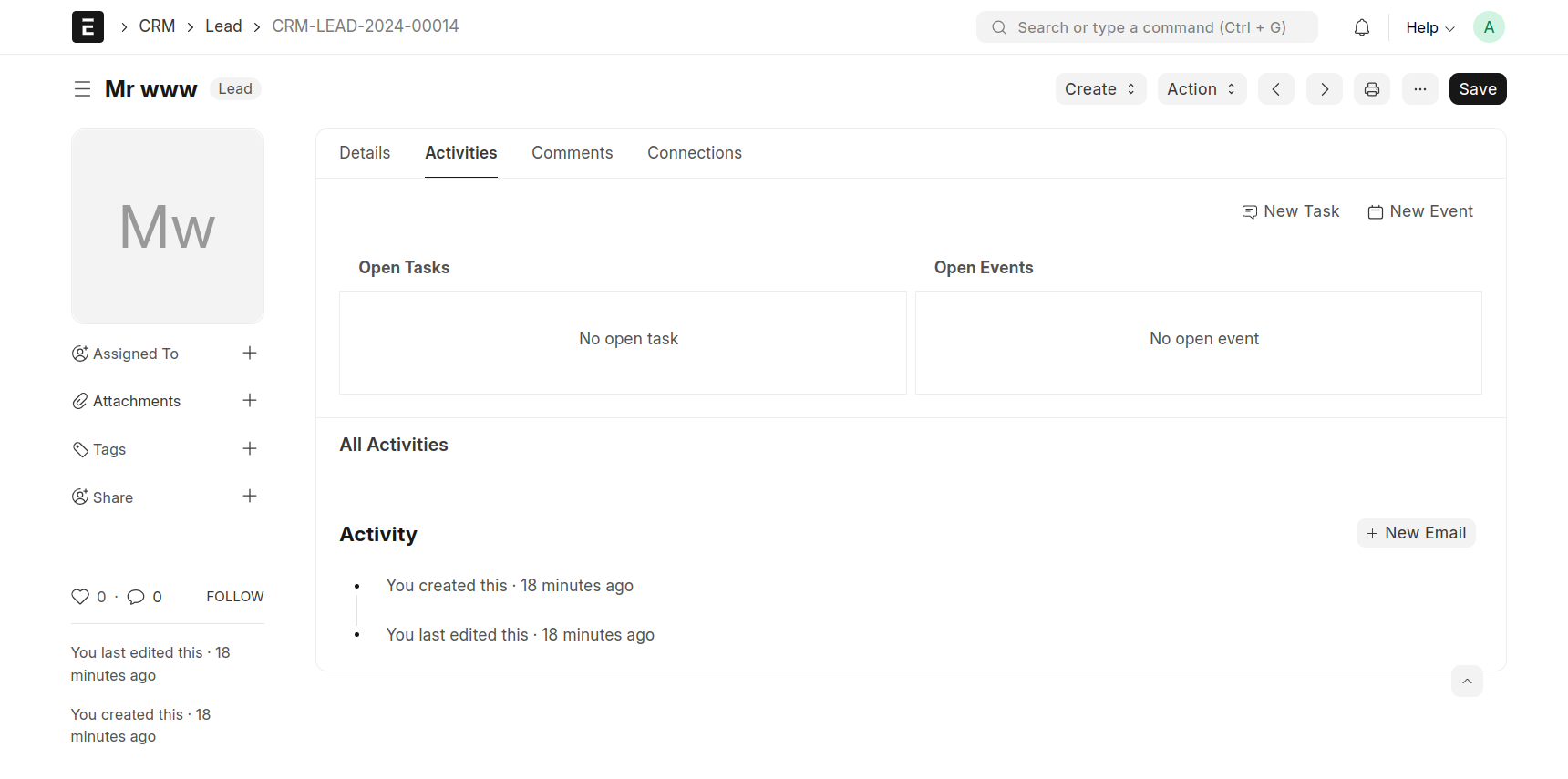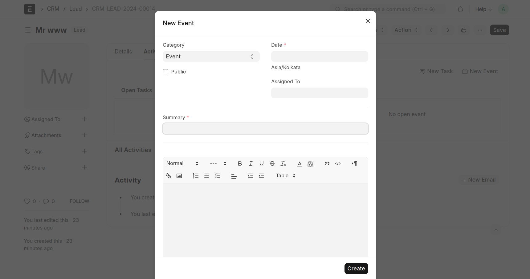 First Create A Lead And Save. Then Open The Lead And Create An New Event That Time Display The New Tab And Fill The Details Then Create