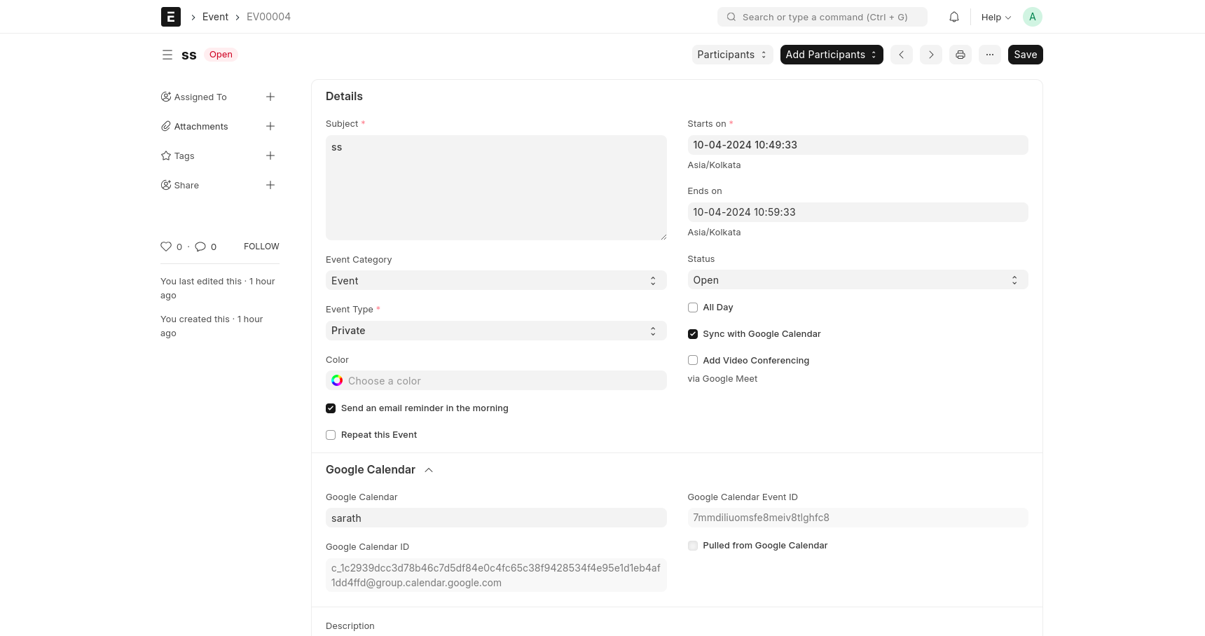 That Time Show The Created Event Details.Then we Can Edit The Document.Mark The Stars On Ends On Date And Tick The Check Box 'Sync with Google Calendar' Then Display The Google Calendar Section Below Then Select The Google Calendar Name And Save The Event. That Time The Event Will Mark On The Registered Google Calendar App.