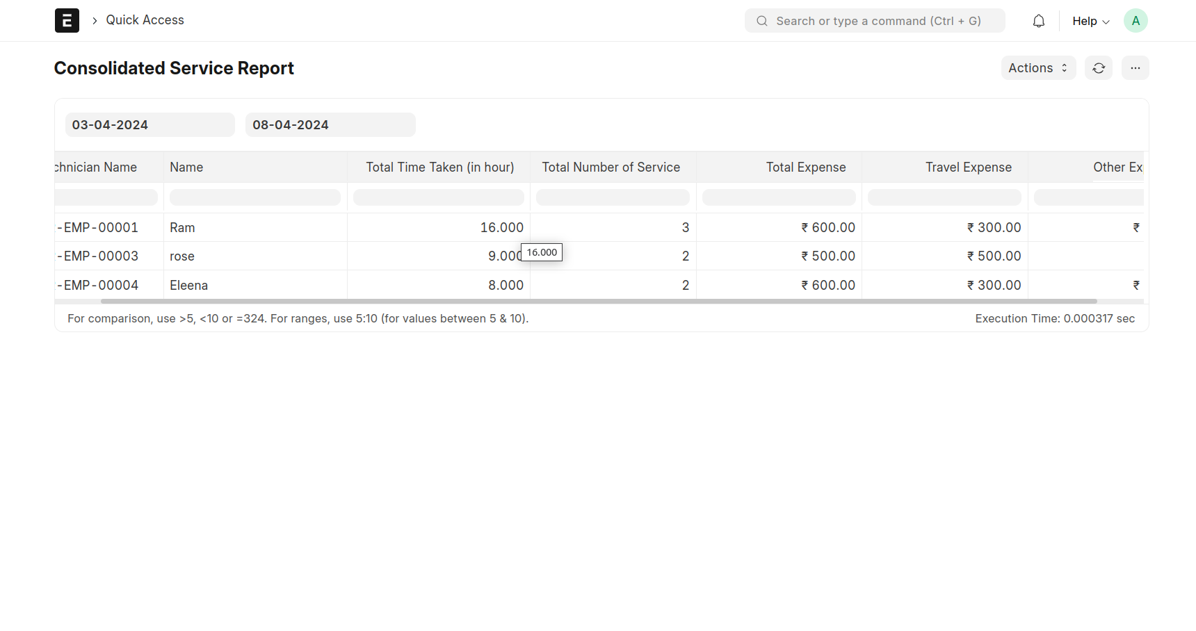 This Report Is Used To Find Employee Service Details. Select The Employee And Select The Date (If You Can Select Weekly, Monthly, Daily Date) Then Show The Details